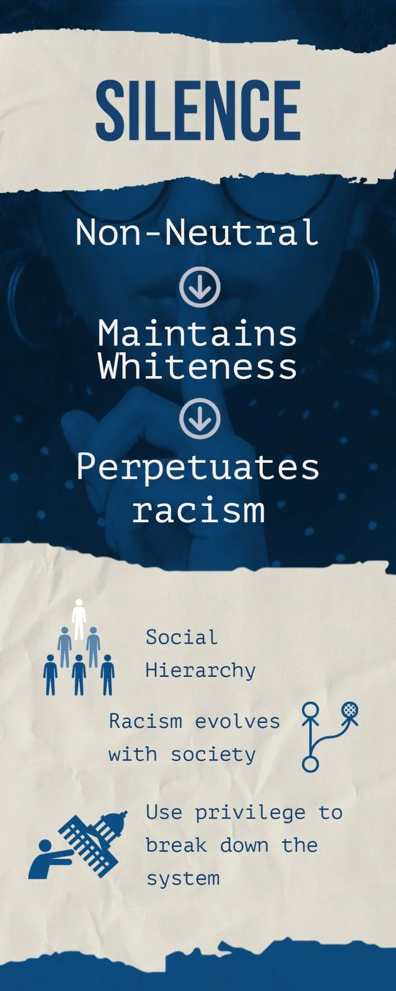 All of this just goes to maintain the status quo, which just so happens to be White people unfairly and always at the top. Silence directly reduces the likelihood of systemic change and pushes us farther away from equality. If we truly want change as a society, and we do, then we need to openly talk about all of the positives and negatives of change in order to make it happen. (we have to openly talk about history too)
